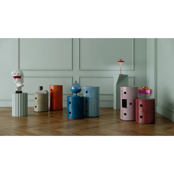 Συρταριερα κυλινδρική σε σχεδίαση Anna Castelli Ferrieri για τον οίκο Kartell που ανταποκρίνονται σε διαφορετικές ανάγκες χρήσης και για να ζουν σε κάθε χώρο του σπιτιού, στο μπάνιο, το υπνοδωμάτιο, την κουζίνα, το καθιστικό και το διάδρομο. Ένα έπιπλο απλό, πρακτικό με χώρους αποθήκευσης.