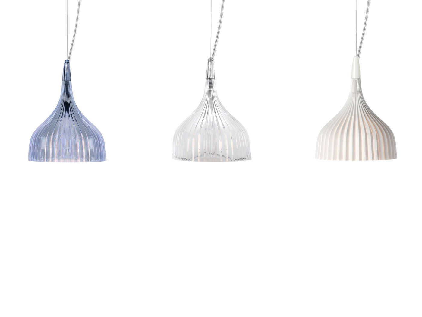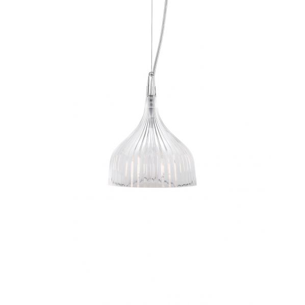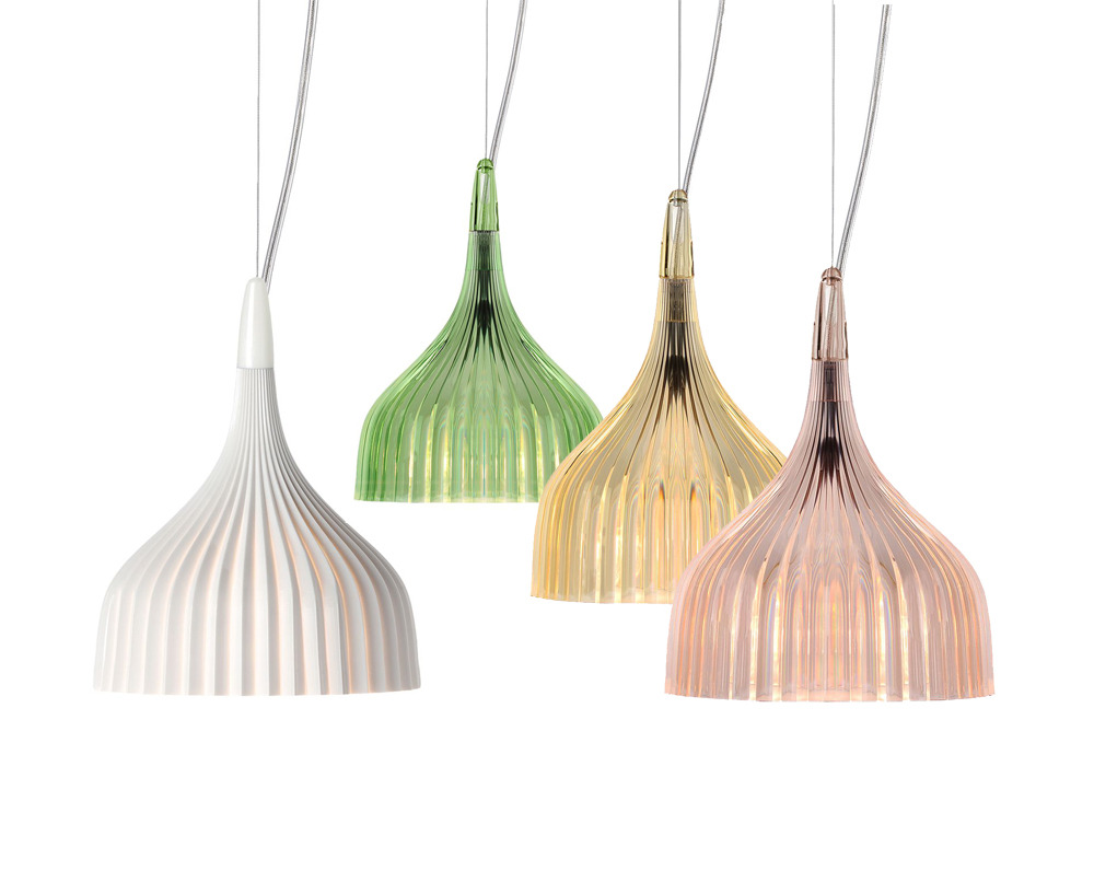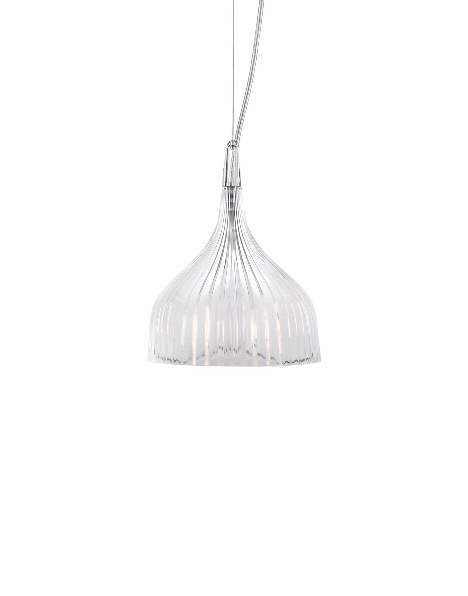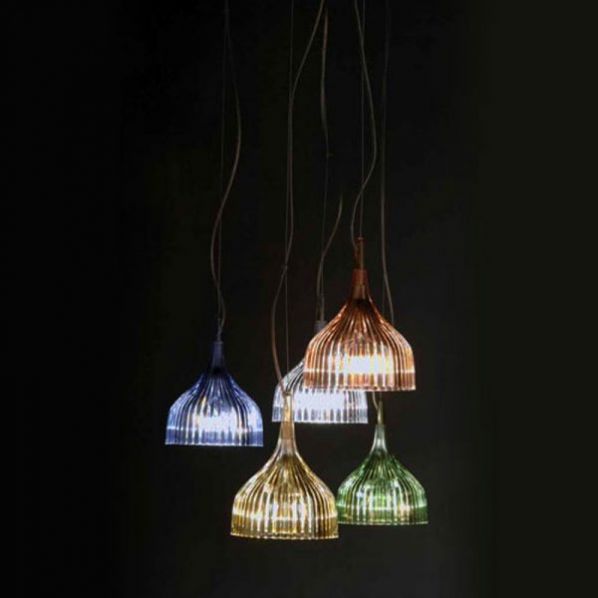 Μια λάμπα με απλό και βασικό ντιζάιν, που διατίθεται σε δυο εκδοχές: απλίκα ή κρεμαστή. Η απλίκα αποτελείται από ένα καπέλο με ροζέτα από πλισέ πολυανθρακικό, που διατίθεται σε πολλά και ποικίλα χρώματα, κι ένα βραχίονα από επιχρωμιωμένο μέταλλο μήκους 11 cm. Η κρεμαστή λάμπα Έ έχει καπέλο από πλισέ πολυανθρακικό και ροζέτα από επιχρωμιωμένο μέταλλο. Το ύψος του καλωδίου ρυθμίζεται από 20 cm έως και 220 cm.