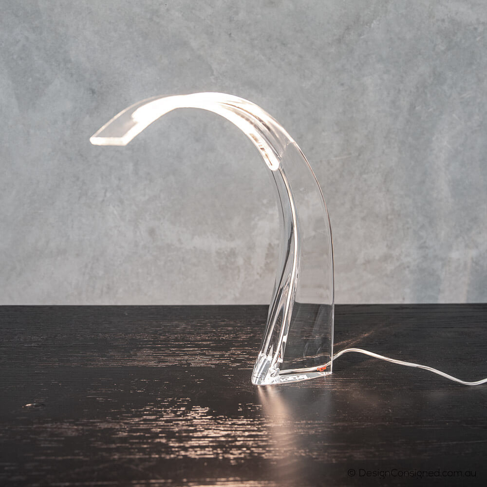 Η επαναστατική επινόηση σʼ αυτή τη λάμπα είναι ότι κατασκευάζεται εντελώς από πολυανθρακικό διαφανές ή χρωματισμένο ενιαία. Από τη μία πλευρά είναι κλασική, πλούσια και παραδοσιακή, από την άλλη πρωτοποριακή, διαφανής και ειρωνική. Η ποιότητα των υλικών και η επεξεργασία τους σε πολύ υψηλά επίπεδα είναι τέτοιες που την κάνουν να μοιάζει με λάμπα από κρύσταλλο, πολύτιμη. Η βάση είναι σε στιλ μπαρόκ και αποτελείται από τρία διακοσμημένα επίπεδα που διασταυρώνονται, το πλατύ καπέλο κατασκευάζεται σε πλισέ έτσι ώστε να δημιουργείται, όταν είναι αναμμένη, ένα παιχνίδισμα χίλιων αντανακλάσεων. Χάρη σε ένα ειδικό σύστημα σύνδεσης του καπέλου μπορεί κανείς να πετύχει τρία διαφορετικά ύψη: 68, 73 και 78 εκατοστά.